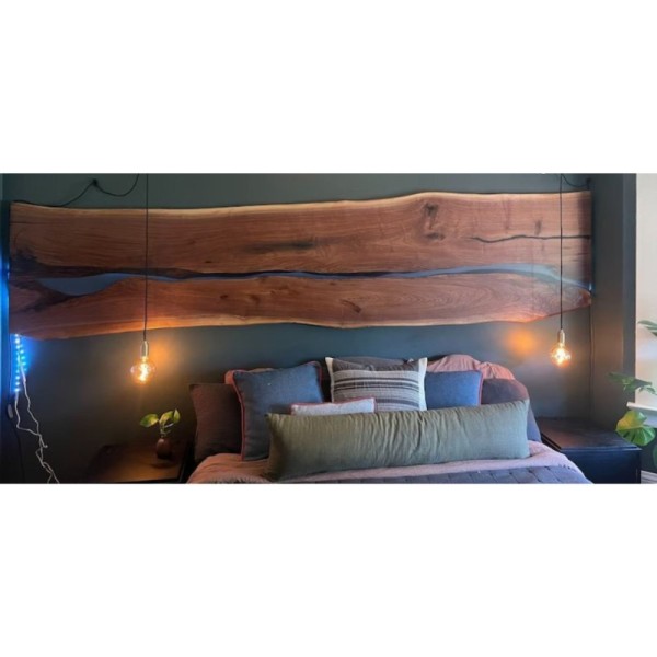 The stunning use of epoxy resin sets the "Ocean River" headboard apart. Inspired by the fluidity of river streams and ocean currents, the resin is skillfully poured into the wood's natural knots and splits, creating dreamy patterns that evoke the peaceful flow of water in motion. The resin’s translucent quality allows the wood’s natural grain to show through, adding depth and dimension to the piece.
