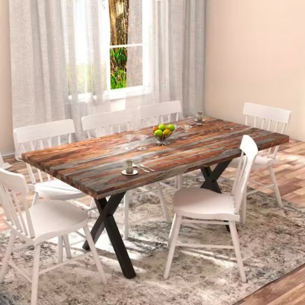 The Sheesham Solid Wood Dining Table with Metal Frame showcases rich wood grain paired with a sturdy metal base. Designed for durability and everyday dining, it adds a warm, modern-industrial touch to any dining space.
