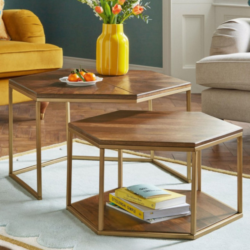 Inspired by organic shapes found in nature, this nesting table set of 2 brings artistic elegance and modern luxury into your living space. The geometric iron base with a rich gold leaf finish beautifully complements the solid wood tabletop, making it a true statement piece.